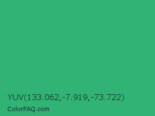 YUV 133.062,-7.919,-73.722 Color is a normal green color and the nearest color is Medium Sea Green #3cb371. Hex code #31b375 and RGB value is rgb(49,179,117). In RGB color space, this color is composed of 19% red, 70% green, 46% blue, In CMYK color space, this color is composed of 73% cyan, 0% magenta, 35% yellow , 30% black , In HSL color space, this color has a hue angle of 151° , 57% saturation and 45% lightness.