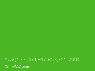YUV 133.064,-47.853,-51.799 Color is a normal green color and the nearest color is Kelly Green #4cbb17. Hex code #4ab624 and RGB value is rgb(74,182,36). In RGB color space, this color is composed of 29% red, 71% green, 14% blue, In CMYK color space, this color is composed of 59% cyan, 0% magenta, 80% yellow , 29% black , In HSL color space, this color has a hue angle of 104° , 67% saturation and 43% lightness.