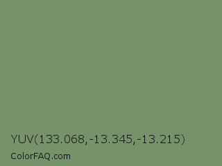 YUV 133.068,-13.345,-13.215 Color is a normal green color and the nearest color is Highland #6f8e63. Hex code #76926a and RGB value is rgb(118,146,106). In RGB color space, this color is composed of 46% red, 57% green, 42% blue, In CMYK color space, this color is composed of 19% cyan, 0% magenta, 27% yellow , 43% black , In HSL color space, this color has a hue angle of 102° , 16% saturation and 49% lightness.