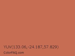 YUV 133.06,-24.187,57.829 Color is a normal red color and the nearest color is Copper Red #cb6d51. Hex code #c76d54 and RGB value is rgb(199,109,84). In RGB color space, this color is composed of 78% red, 43% green, 33% blue, In CMYK color space, this color is composed of 0% cyan, 45% magenta, 58% yellow , 22% black , In HSL color space, this color has a hue angle of 13° , 51% saturation and 55% lightness.