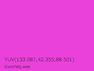 YUV 133.087,42.355,88.501 Color is a normal magenta color and the nearest color is Purple Pizzazz #fe4eda. Hex code #ea41db and RGB value is rgb(234,65,219). In RGB color space, this color is composed of 92% red, 25% green, 86% blue, In CMYK color space, this color is composed of 0% cyan, 72% magenta, 6% yellow , 8% black , In HSL color space, this color has a hue angle of 305° , 80% saturation and 59% lightness.
