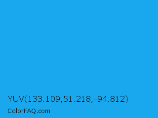 YUV 133.109,51.218,-94.812 Color is a normal blue color and the nearest color is Button Blue #24a0ed. Hex code #19a8ed and RGB value is rgb(25,168,237). In RGB color space, this color is composed of 10% red, 66% green, 93% blue, In CMYK color space, this color is composed of 89% cyan, 29% magenta, 0% yellow , 7% black , In HSL color space, this color has a hue angle of 200° , 85% saturation and 51% lightness.