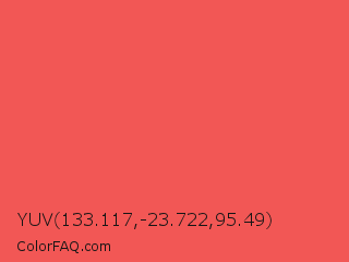 YUV 133.117,-23.722,95.49 Color is a light red color and the nearest color is Sunset Orange #fd5e53. Hex code #f25755 and RGB value is rgb(242,87,85). In RGB color space, this color is composed of 95% red, 34% green, 33% blue, In CMYK color space, this color is composed of 0% cyan, 64% magenta, 65% yellow , 5% black , In HSL color space, this color has a hue angle of 1° , 86% saturation and 64% lightness.