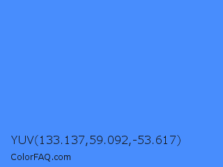 YUV 133.137,59.092,-53.617 Color is a light blue color and the nearest color is Blueberry #4f86f7. Hex code #488dfd and RGB value is rgb(72,141,253). In RGB color space, this color is composed of 28% red, 55% green, 99% blue, In CMYK color space, this color is composed of 72% cyan, 44% magenta, 0% yellow , 1% black , In HSL color space, this color has a hue angle of 217° , 98% saturation and 64% lightness.