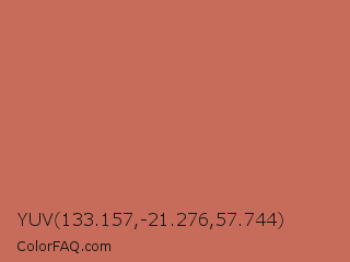 YUV 133.157,-21.276,57.744 Color is a normal red color and the nearest color is Copper Red #cb6d51. Hex code #c76c5a and RGB value is rgb(199,108,90). In RGB color space, this color is composed of 78% red, 42% green, 35% blue, In CMYK color space, this color is composed of 0% cyan, 46% magenta, 55% yellow , 22% black , In HSL color space, this color has a hue angle of 10° , 49% saturation and 57% lightness.