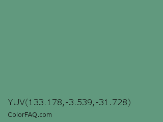 YUV 133.178,-3.539,-31.728 Color is a normal green color and the nearest color is Shiny Shamrock #5fa778. Hex code #61997e and RGB value is rgb(97,153,126). In RGB color space, this color is composed of 38% red, 60% green, 49% blue, In CMYK color space, this color is composed of 37% cyan, 0% magenta, 18% yellow , 40% black , In HSL color space, this color has a hue angle of 151° , 22% saturation and 49% lightness.