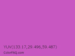 YUV 133.17,29.496,59.487 Color is a normal magenta color and the nearest color is Fuchsia Pink #c154c1. Hex code #c957c1 and RGB value is rgb(201,87,193). In RGB color space, this color is composed of 79% red, 34% green, 76% blue, In CMYK color space, this color is composed of 0% cyan, 57% magenta, 4% yellow , 21% black , In HSL color space, this color has a hue angle of 304° , 51% saturation and 56% lightness.