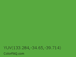 YUV 133.284,-34.65,-39.714 Color is a normal green color and the nearest color is Apple #4fa83d. Hex code #58aa3f and RGB value is rgb(88,170,63). In RGB color space, this color is composed of 35% red, 67% green, 25% blue, In CMYK color space, this color is composed of 48% cyan, 0% magenta, 63% yellow , 33% black , In HSL color space, this color has a hue angle of 106° , 46% saturation and 46% lightness.