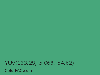 YUV 133.28,-5.068,-54.62 Color is a normal green color and the nearest color is Ocean Green #41aa78. Hex code #47a77b and RGB value is rgb(71,167,123). In RGB color space, this color is composed of 28% red, 65% green, 48% blue, In CMYK color space, this color is composed of 57% cyan, 0% magenta, 26% yellow , 35% black , In HSL color space, this color has a hue angle of 153° , 40% saturation and 47% lightness.