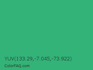 YUV 133.29,-7.045,-73.922 Color is a normal green color and the nearest color is Medium Sea Green #3cb371. Hex code #31b377 and RGB value is rgb(49,179,119). In RGB color space, this color is composed of 19% red, 70% green, 47% blue, In CMYK color space, this color is composed of 73% cyan, 0% magenta, 34% yellow , 30% black , In HSL color space, this color has a hue angle of 152° , 57% saturation and 45% lightness.