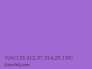 YUV 133.312,37.314,25.159 Color is a light purple color and the nearest color is Rich Lavender #a76bcf. Hex code #a268d1 and RGB value is rgb(162,104,209). In RGB color space, this color is composed of 64% red, 41% green, 82% blue, In CMYK color space, this color is composed of 22% cyan, 50% magenta, 0% yellow , 18% black , In HSL color space, this color has a hue angle of 273° , 53% saturation and 61% lightness.