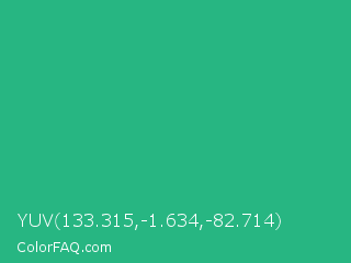 YUV 133.315,-1.634,-82.714 Color is a normal green color and the nearest color is Jungle Green #29ab87. Hex code #27b682 and RGB value is rgb(39,182,130). In RGB color space, this color is composed of 15% red, 71% green, 51% blue, In CMYK color space, this color is composed of 79% cyan, 0% magenta, 29% yellow , 29% black , In HSL color space, this color has a hue angle of 158° , 65% saturation and 43% lightness.