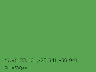 YUV 133.401,-25.341,-38.94 Color is a normal green color and the nearest color is Fruit Salad #4f9d5d. Hex code #59a652 and RGB value is rgb(89,166,82). In RGB color space, this color is composed of 35% red, 65% green, 32% blue, In CMYK color space, this color is composed of 46% cyan, 0% magenta, 51% yellow , 35% black , In HSL color space, this color has a hue angle of 115° , 34% saturation and 49% lightness.