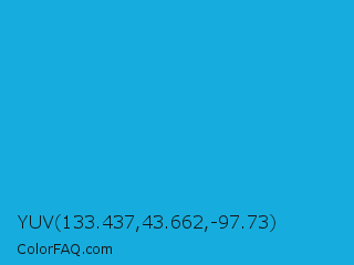 YUV 133.437,43.662,-97.73 Color is a normal blue color and the nearest color is Battery Charged Blue #1dacd6. Hex code #16adde and RGB value is rgb(22,173,222). In RGB color space, this color is composed of 9% red, 68% green, 87% blue, In CMYK color space, this color is composed of 90% cyan, 22% magenta, 0% yellow , 13% black , In HSL color space, this color has a hue angle of 195° , 82% saturation and 48% lightness.
