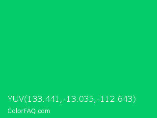 YUV 133.441,-13.035,-112.643 Color is a normal green color and the nearest color is Malachite #0bda51. Hex code #05cc6b and RGB value is rgb(5,204,107). In RGB color space, this color is composed of 2% red, 80% green, 42% blue, In CMYK color space, this color is composed of 98% cyan, 0% magenta, 48% yellow , 20% black , In HSL color space, this color has a hue angle of 151° , 95% saturation and 41% lightness.