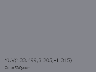 YUV 133.499,3.205,-1.315 Color is a normal blue color and the nearest color is Suva Gray #888387. Hex code #84858c and RGB value is rgb(132,133,140). In RGB color space, this color is composed of 52% red, 52% green, 55% blue, In CMYK color space, this color is composed of 6% cyan, 5% magenta, 0% yellow , 45% black , In HSL color space, this color has a hue angle of 233° , 3% saturation and 53% lightness.