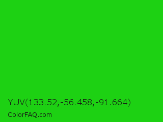 YUV 133.52,-56.458,-91.664 Color is a normal green color and the nearest color is Lime Green #32cd32. Hex code #1dd113 and RGB value is rgb(29,209,19). In RGB color space, this color is composed of 11% red, 82% green, 7% blue, In CMYK color space, this color is composed of 86% cyan, 0% magenta, 91% yellow , 18% black , In HSL color space, this color has a hue angle of 117° , 83% saturation and 45% lightness.