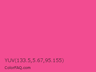 YUV 133.5,5.67,95.155 Color is a light rose color and the nearest color is French Rose #f64a8a. Hex code #f24c91 and RGB value is rgb(242,76,145). In RGB color space, this color is composed of 95% red, 30% green, 57% blue, In CMYK color space, this color is composed of 0% cyan, 69% magenta, 40% yellow , 5% black , In HSL color space, this color has a hue angle of 335° , 86% saturation and 62% lightness.