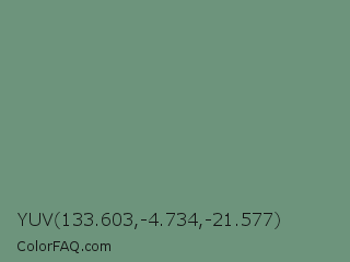 YUV 133.603,-4.734,-21.577 Color is a normal green color and the nearest color is Laurel #749378. Hex code #6d947c and RGB value is rgb(109,148,124). In RGB color space, this color is composed of 43% red, 58% green, 49% blue, In CMYK color space, this color is composed of 26% cyan, 0% magenta, 16% yellow , 42% black , In HSL color space, this color has a hue angle of 143° , 15% saturation and 50% lightness.