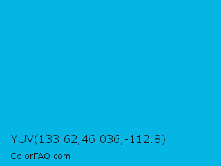 YUV 133.62,46.036,-112.8 Color is a normal cyan color and the nearest color is Cyan Process #00b7eb. Hex code #05b5e3 and RGB value is rgb(5,181,227). In RGB color space, this color is composed of 2% red, 71% green, 89% blue, In CMYK color space, this color is composed of 98% cyan, 20% magenta, 0% yellow , 11% black , In HSL color space, this color has a hue angle of 192° , 96% saturation and 45% lightness.