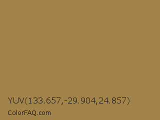 YUV 133.657,-29.904,24.857 Color is a normal orange color and the nearest color is Driftwood #af8751. Hex code #a28349 and RGB value is rgb(162,131,73). In RGB color space, this color is composed of 64% red, 51% green, 29% blue, In CMYK color space, this color is composed of 0% cyan, 19% magenta, 55% yellow , 36% black , In HSL color space, this color has a hue angle of 39° , 38% saturation and 46% lightness.