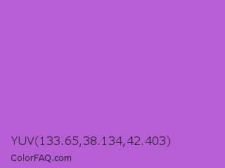 YUV 133.65,38.134,42.403 Color is a normal purple color and the nearest color is Rich Lilac #b666d2. Hex code #b65ed3 and RGB value is rgb(182,94,211). In RGB color space, this color is composed of 71% red, 37% green, 83% blue, In CMYK color space, this color is composed of 14% cyan, 55% magenta, 0% yellow , 17% black , In HSL color space, this color has a hue angle of 285° , 57% saturation and 60% lightness.