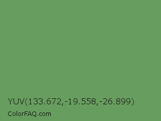 YUV 133.672,-19.558,-26.899 Color is a normal green color and the nearest color is Russian Green #679267. Hex code #679d5e and RGB value is rgb(103,157,94). In RGB color space, this color is composed of 40% red, 62% green, 37% blue, In CMYK color space, this color is composed of 34% cyan, 0% magenta, 40% yellow , 38% black , In HSL color space, this color has a hue angle of 111° , 25% saturation and 49% lightness.