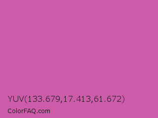 YUV 133.679,17.413,61.672 Color is a normal magenta color and the nearest color is Super Pink #cf6ba9. Hex code #cc5ba9 and RGB value is rgb(204,91,169). In RGB color space, this color is composed of 80% red, 36% green, 66% blue, In CMYK color space, this color is composed of 0% cyan, 55% magenta, 17% yellow , 20% black , In HSL color space, this color has a hue angle of 319° , 53% saturation and 58% lightness.