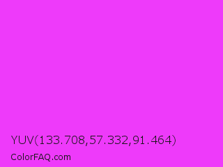 YUV 133.708,57.332,91.464 Color is a normal magenta color and the nearest color is Purple Pizzazz #fe4eda. Hex code #ee3afa and RGB value is rgb(238,58,250). In RGB color space, this color is composed of 93% red, 23% green, 98% blue, In CMYK color space, this color is composed of 5% cyan, 77% magenta, 0% yellow , 2% black , In HSL color space, this color has a hue angle of 296° , 95% saturation and 60% lightness.