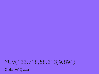 YUV 133.718,58.313,9.894 Color is a light indigo color and the nearest color is Navy Purple #9457eb. Hex code #9169fc and RGB value is rgb(145,105,252). In RGB color space, this color is composed of 57% red, 41% green, 99% blue, In CMYK color space, this color is composed of 42% cyan, 58% magenta, 0% yellow , 1% black , In HSL color space, this color has a hue angle of 256° , 96% saturation and 70% lightness.