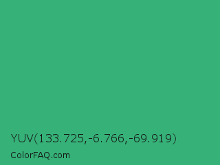 YUV 133.725,-6.766,-69.919 Color is a normal green color and the nearest color is Medium Sea Green #3cb371. Hex code #36b178 and RGB value is rgb(54,177,120). In RGB color space, this color is composed of 21% red, 69% green, 47% blue, In CMYK color space, this color is composed of 69% cyan, 0% magenta, 32% yellow , 31% black , In HSL color space, this color has a hue angle of 152° , 53% saturation and 45% lightness.