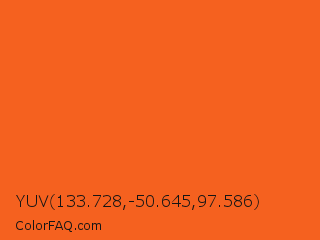 YUV 133.728,-50.645,97.586 Color is a normal orange color and the nearest color is Giants Orange #fe5a1d. Hex code #f5611f and RGB value is rgb(245,97,31). In RGB color space, this color is composed of 96% red, 38% green, 12% blue, In CMYK color space, this color is composed of 0% cyan, 60% magenta, 87% yellow , 4% black , In HSL color space, this color has a hue angle of 19° , 91% saturation and 54% lightness.