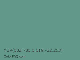 YUV 133.731,1.119,-32.213 Color is a normal green color and the nearest color is Patina #639a8f. Hex code #619888 and RGB value is rgb(97,152,136). In RGB color space, this color is composed of 38% red, 60% green, 53% blue, In CMYK color space, this color is composed of 36% cyan, 0% magenta, 11% yellow , 40% black , In HSL color space, this color has a hue angle of 163° , 22% saturation and 49% lightness.