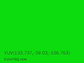 YUV 133.737,-59.03,-106.763 Color is a normal green color and the nearest color is Green #00ff00. Hex code #0cdb0e and RGB value is rgb(12,219,14). In RGB color space, this color is composed of 5% red, 86% green, 5% blue, In CMYK color space, this color is composed of 95% cyan, 0% magenta, 94% yellow , 14% black , In HSL color space, this color has a hue angle of 121° , 90% saturation and 45% lightness.