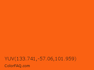 YUV 133.741,-57.06,101.959 Color is a normal orange color and the nearest color is Giants Orange #fe5a1d. Hex code #fa6112 and RGB value is rgb(250,97,18). In RGB color space, this color is composed of 98% red, 38% green, 7% blue, In CMYK color space, this color is composed of 0% cyan, 61% magenta, 93% yellow , 2% black , In HSL color space, this color has a hue angle of 20° , 96% saturation and 53% lightness.
