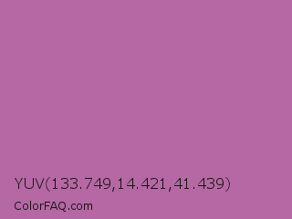 YUV 133.749,14.421,41.439 Color is a normal magenta color and the nearest color is Pearly Purple #b768a2. Hex code #b568a3 and RGB value is rgb(181,104,163). In RGB color space, this color is composed of 71% red, 41% green, 64% blue, In CMYK color space, this color is composed of 0% cyan, 43% magenta, 10% yellow , 29% black , In HSL color space, this color has a hue angle of 314° , 34% saturation and 56% lightness.