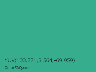 YUV 133.771,3.564,-69.959 Color is a normal cyan color and the nearest color is Zomp #39a78e. Hex code #36ad8d and RGB value is rgb(54,173,141). In RGB color space, this color is composed of 21% red, 68% green, 55% blue, In CMYK color space, this color is composed of 69% cyan, 0% magenta, 18% yellow , 32% black , In HSL color space, this color has a hue angle of 164° , 52% saturation and 45% lightness.