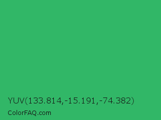 YUV 133.814,-15.191,-74.382 Color is a normal green color and the nearest color is Medium Sea Green #3cb371. Hex code #31b767 and RGB value is rgb(49,183,103). In RGB color space, this color is composed of 19% red, 72% green, 40% blue, In CMYK color space, this color is composed of 73% cyan, 0% magenta, 44% yellow , 28% black , In HSL color space, this color has a hue angle of 144° , 58% saturation and 45% lightness.
