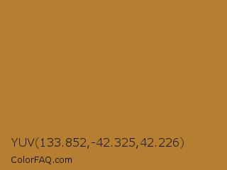 YUV 133.852,-42.325,42.226 Color is a normal orange color and the nearest color is Copper #b87333. Hex code #b67e30 and RGB value is rgb(182,126,48). In RGB color space, this color is composed of 71% red, 49% green, 19% blue, In CMYK color space, this color is composed of 0% cyan, 31% magenta, 74% yellow , 29% black , In HSL color space, this color has a hue angle of 35° , 58% saturation and 45% lightness.