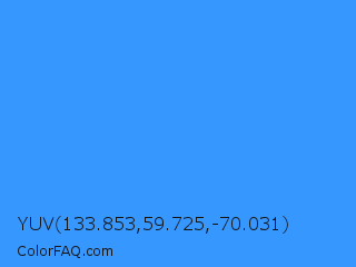 YUV 133.853,59.725,-70.031 Color is a light blue color and the nearest color is Brilliant Azure #3399ff. Hex code #3697ff and RGB value is rgb(54,151,255). In RGB color space, this color is composed of 21% red, 59% green, 100% blue, In CMYK color space, this color is composed of 79% cyan, 41% magenta, 0% yellow , 0% black , In HSL color space, this color has a hue angle of 211° , 100% saturation and 61% lightness.