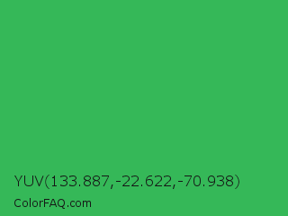 YUV 133.887,-22.622,-70.938 Color is a normal green color and the nearest color is Chateau Green #40a860. Hex code #35b858 and RGB value is rgb(53,184,88). In RGB color space, this color is composed of 21% red, 72% green, 35% blue, In CMYK color space, this color is composed of 71% cyan, 0% magenta, 52% yellow , 28% black , In HSL color space, this color has a hue angle of 136° , 55% saturation and 46% lightness.