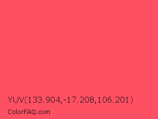 YUV 133.904,-17.208,106.201 Color is a light red color and the nearest color is Infra Red #ff496c. Hex code #ff4f63 and RGB value is rgb(255,79,99). In RGB color space, this color is composed of 100% red, 31% green, 39% blue, In CMYK color space, this color is composed of 0% cyan, 69% magenta, 61% yellow , 0% black , In HSL color space, this color has a hue angle of 353° , 100% saturation and 65% lightness.
