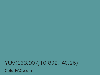 YUV 133.907,10.892,-40.26 Color is a normal cyan color and the nearest color is Cadet Blue #5f9ea0. Hex code #58999c and RGB value is rgb(88,153,156). In RGB color space, this color is composed of 35% red, 60% green, 61% blue, In CMYK color space, this color is composed of 44% cyan, 2% magenta, 0% yellow , 39% black , In HSL color space, this color has a hue angle of 183° , 28% saturation and 48% lightness.