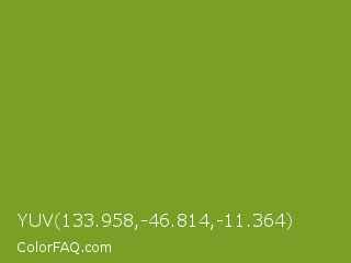 YUV 133.958,-46.814,-11.364 Color is a normal lime color and the nearest color is Wasabi #788a25. Hex code #799f27 and RGB value is rgb(121,159,39). In RGB color space, this color is composed of 47% red, 62% green, 15% blue, In CMYK color space, this color is composed of 24% cyan, 0% magenta, 75% yellow , 38% black , In HSL color space, this color has a hue angle of 79° , 61% saturation and 39% lightness.