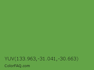 YUV 133.963,-31.041,-30.663 Color is a normal green color and the nearest color is Palm Leaf #6f9940. Hex code #63a447 and RGB value is rgb(99,164,71). In RGB color space, this color is composed of 39% red, 64% green, 28% blue, In CMYK color space, this color is composed of 40% cyan, 0% magenta, 57% yellow , 36% black , In HSL color space, this color has a hue angle of 102° , 40% saturation and 46% lightness.
