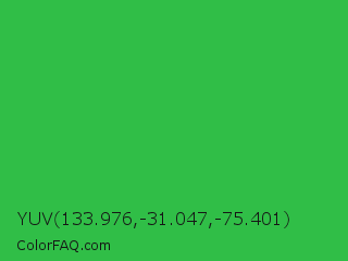 YUV 133.976,-31.047,-75.401 Color is a normal green color and the nearest color is Wageningen Green #34b233. Hex code #30be47 and RGB value is rgb(48,190,71). In RGB color space, this color is composed of 19% red, 75% green, 28% blue, In CMYK color space, this color is composed of 75% cyan, 0% magenta, 63% yellow , 25% black , In HSL color space, this color has a hue angle of 130° , 60% saturation and 47% lightness.