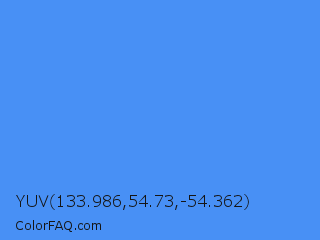 YUV 133.986,54.73,-54.362 Color is a light blue color and the nearest color is Blueberry #4f86f7. Hex code #4890f5 and RGB value is rgb(72,144,245). In RGB color space, this color is composed of 28% red, 56% green, 96% blue, In CMYK color space, this color is composed of 71% cyan, 41% magenta, 0% yellow , 4% black , In HSL color space, this color has a hue angle of 215° , 90% saturation and 62% lightness.