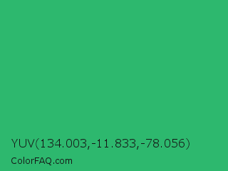 YUV 134.003,-11.833,-78.056 Color is a normal green color and the nearest color is Medium Sea Green #3cb371. Hex code #2db86e and RGB value is rgb(45,184,110). In RGB color space, this color is composed of 18% red, 72% green, 43% blue, In CMYK color space, this color is composed of 76% cyan, 0% magenta, 40% yellow , 28% black , In HSL color space, this color has a hue angle of 148° , 61% saturation and 45% lightness.