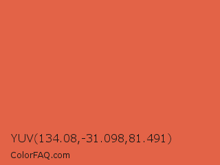 YUV 134.08,-31.098,81.491 Color is a normal red color and the nearest color is Jelly Bean #da614e. Hex code #e36347 and RGB value is rgb(227,99,71). In RGB color space, this color is composed of 89% red, 39% green, 28% blue, In CMYK color space, this color is composed of 0% cyan, 56% magenta, 69% yellow , 11% black , In HSL color space, this color has a hue angle of 11° , 74% saturation and 58% lightness.