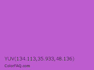 YUV 134.113,35.933,48.136 Color is a normal purple color and the nearest color is Medium Orchid #ba55d3. Hex code #bd5ccf and RGB value is rgb(189,92,207). In RGB color space, this color is composed of 74% red, 36% green, 81% blue, In CMYK color space, this color is composed of 9% cyan, 56% magenta, 0% yellow , 19% black , In HSL color space, this color has a hue angle of 291° , 55% saturation and 59% lightness.